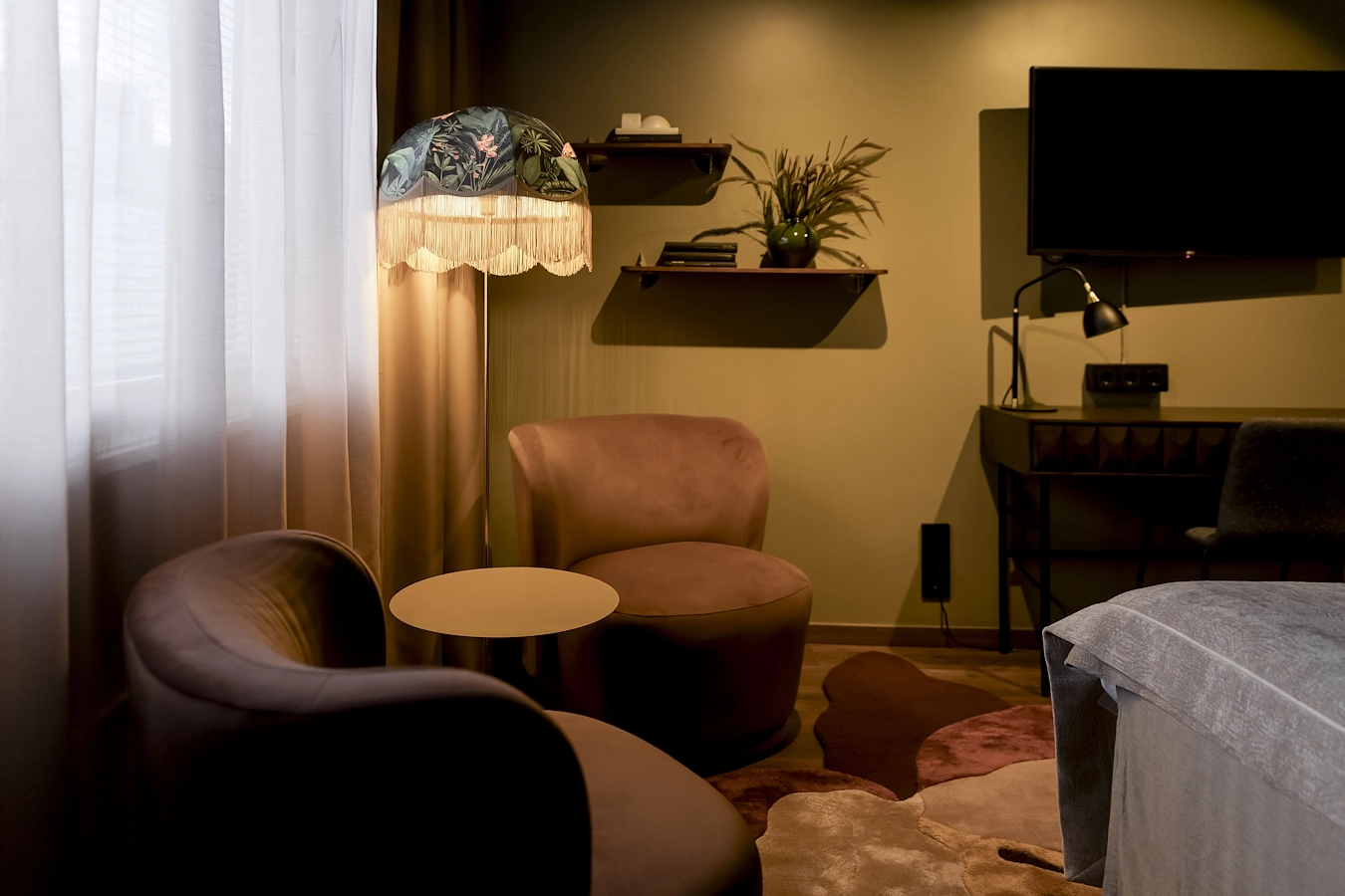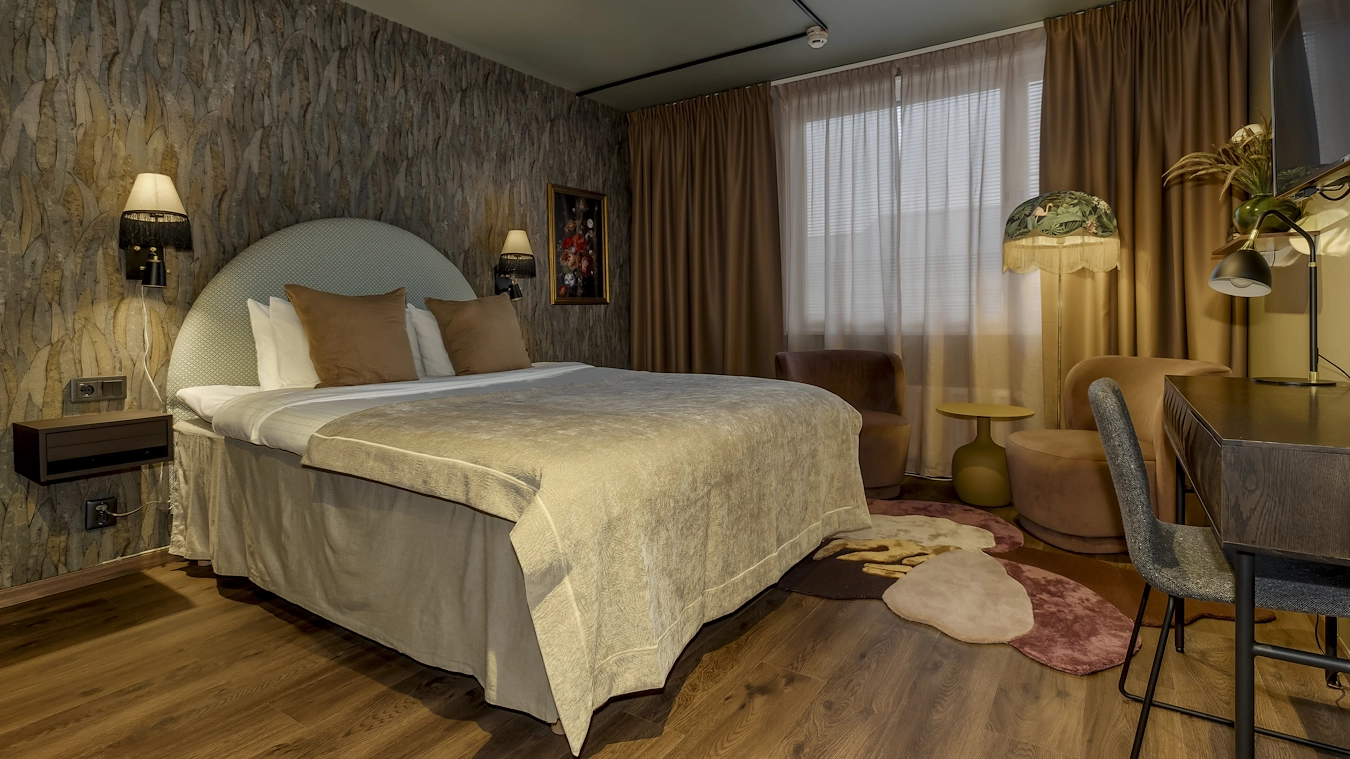 Fint dubbelrum för en eller två personer, med möjlighet till två enkelsängar eller en Queensize-säng. Rummet har skrivbord med stol och en fåtölj. Badrummet är utrustat med dusch eller badkar.